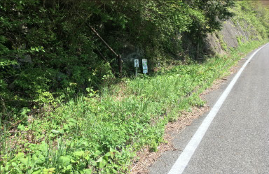 最初のカーブの山側に歩道とかかれた表示があり、小さく登山口の表示もあり(D)。
